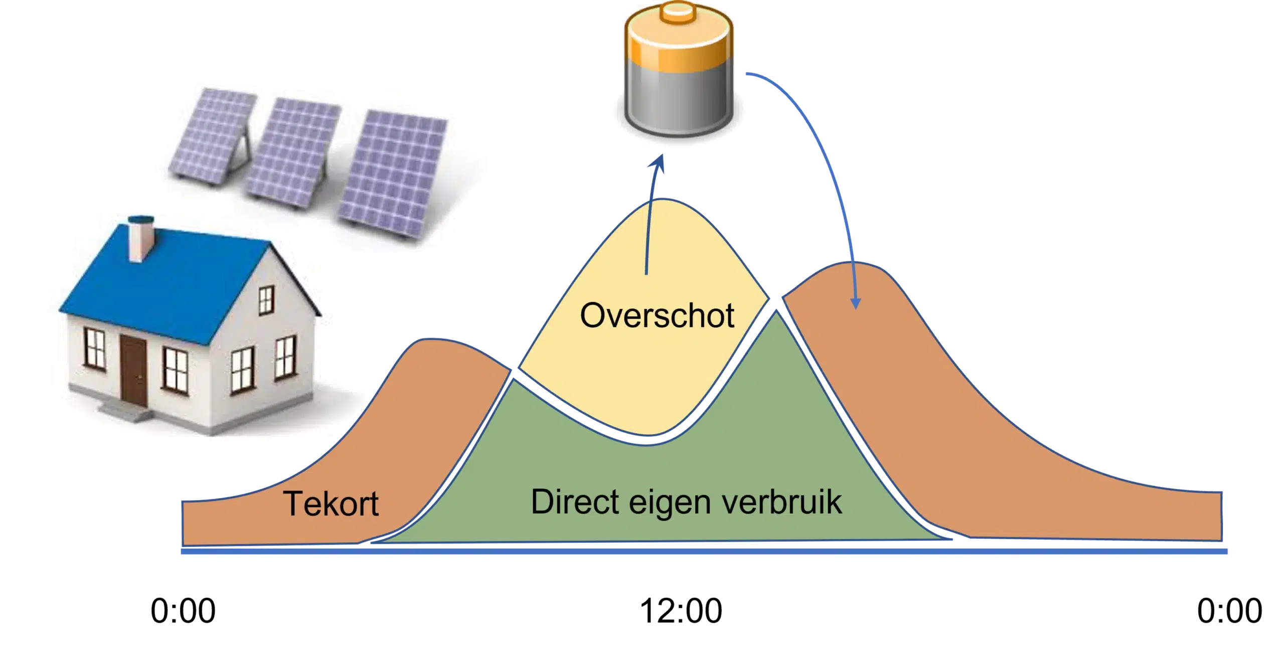 Hoe werkt een thuisbatterij? Een thuisbatterij heeft voor een ingewikkeld probleem een simpele oplossing. Overdag wek je meer stroom op dan je verbruikt. Die overtollige energie wordt opgeslagen in jouw thuisaccu. ’s Avonds (wanneer de zon onder is en jouw verbruik stijgt) levert de batterij die energie weer terug aan het huis.